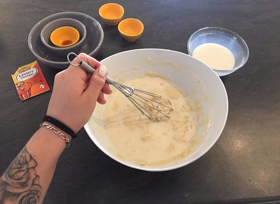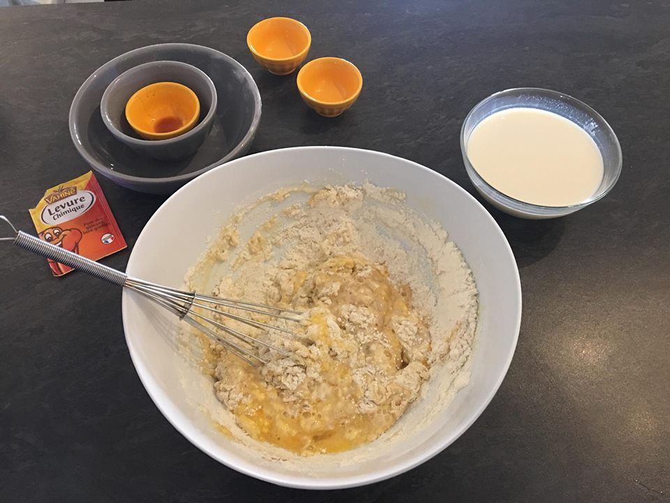 ✔ Mélanger le tout, en ajoutant petit à petit le lait afin d'obtenir un pâte liquide de texture plus épaisse qu'une pâte à crêpe.