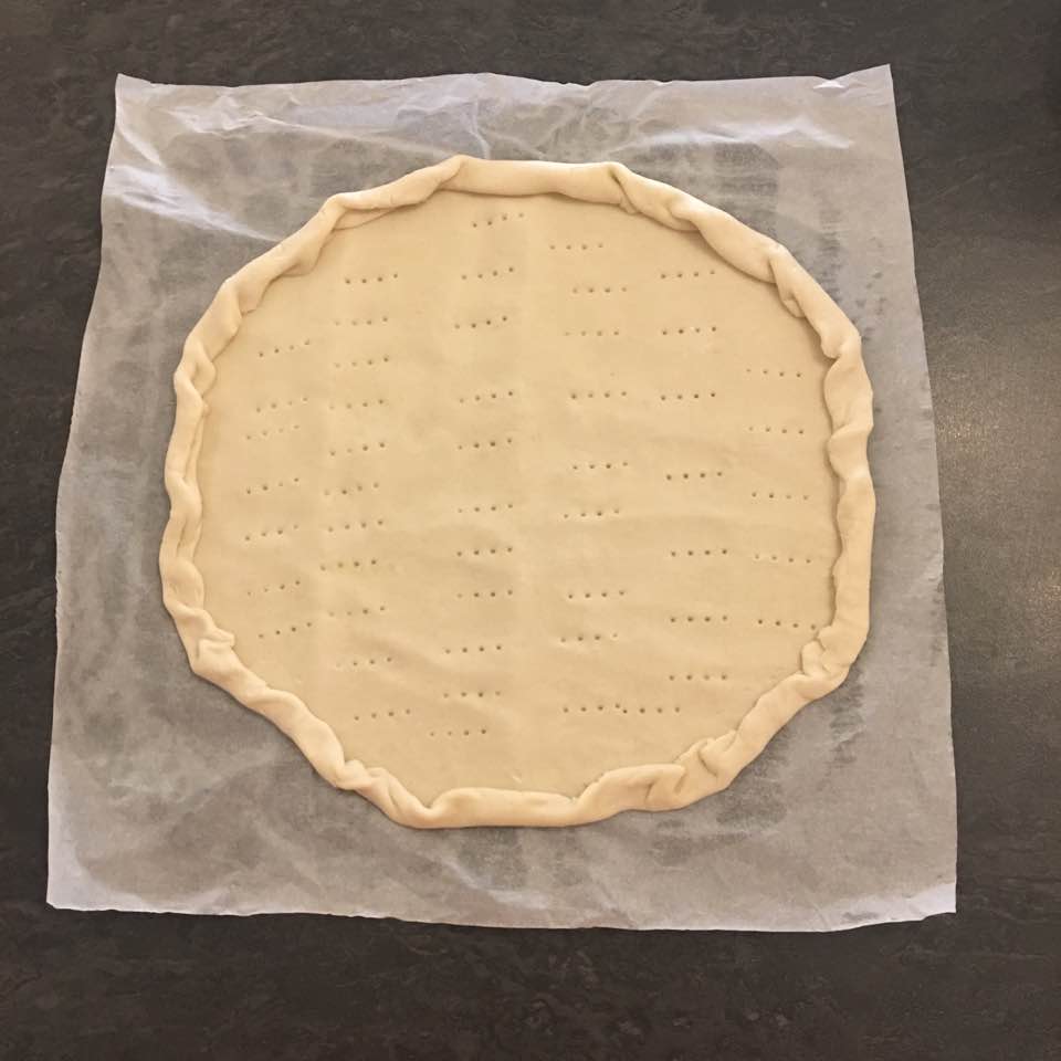 Avec une fourchette, piquez la pùte. Cela permet d'éviter le gonflement de la pùte et aussi ça aide à faire passer la vapeur lors de la cuisson pour que la pùte ne cloque pas.